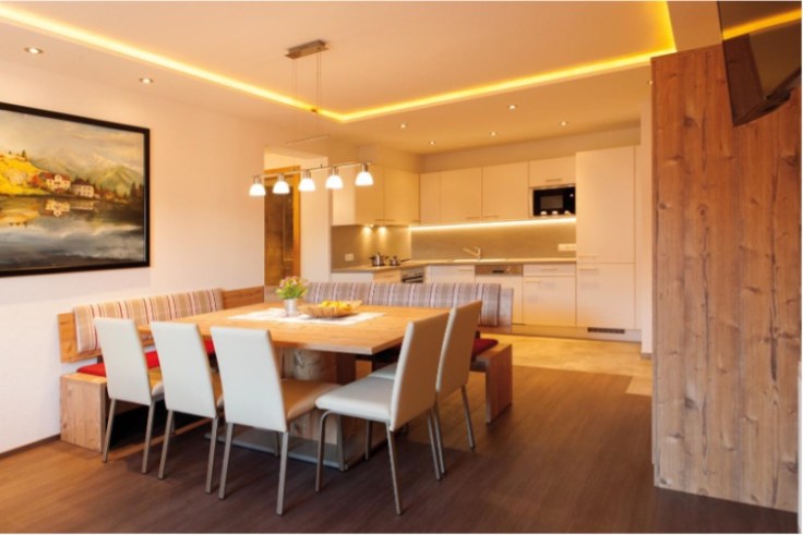 De royale woon-, kook- en eetruimte vormt het hart van het appartement: een sfeervolle plek waar samenkomen centraal staat. Ideaal voor grotere gezelschappen die na een actieve dag in de bergen willen ontspannen en genieten van de alpine sfeer.