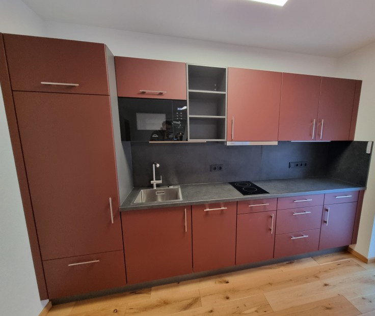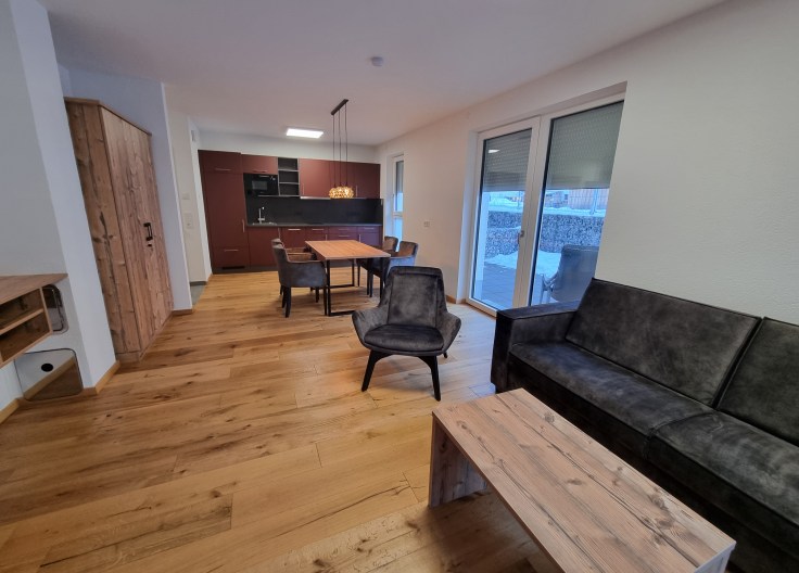 Vervolgens opent zich de lichte en sfeervolle woon- en eetruimte met open keuken en zithoek. Dankzij de grote raampartijen geniet u hier van veel daglicht en een aangename woonbeleving. Vanuit de woonkamer heeft u directe toegang tot het zonnige terras van ca. 19 m², ideaal om te genieten van de alpine omgeving.